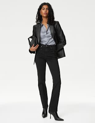 These cotton-blend jeans are updated with a scattering of sparkling gems to make them extra special. Straight-leg style, with a flattering high waist and ankle-grazing hem. Made from soft, comfortable denim featuring added stretch for comfort.